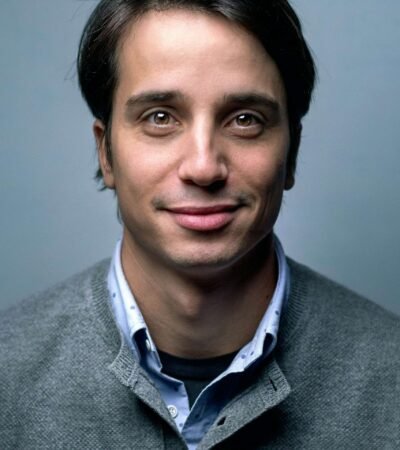 A hand holding a smartphone displaying a website or app interface related to creating a brand. The screen shows options for Home, Discovery, Members, and Topics.